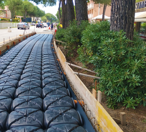 La solución fue, tras la preparación del terreno, la construcción de un carril bici con una cámara por debajo. En este caso concreto las características de la zona no permitían recrecer demasiado el suelo, por lo que se empleó el Cúpolex h13,5.