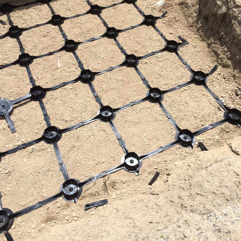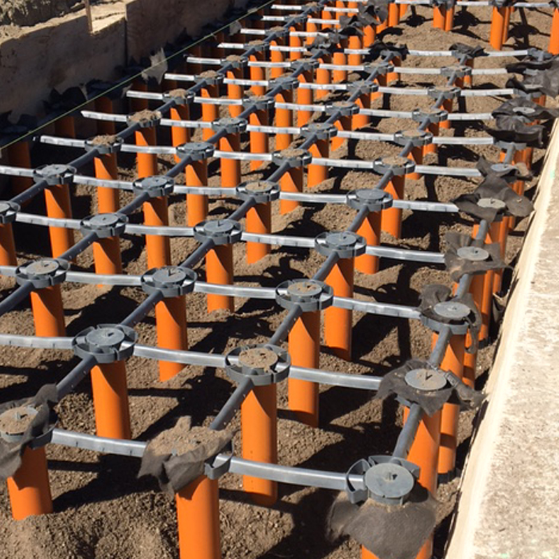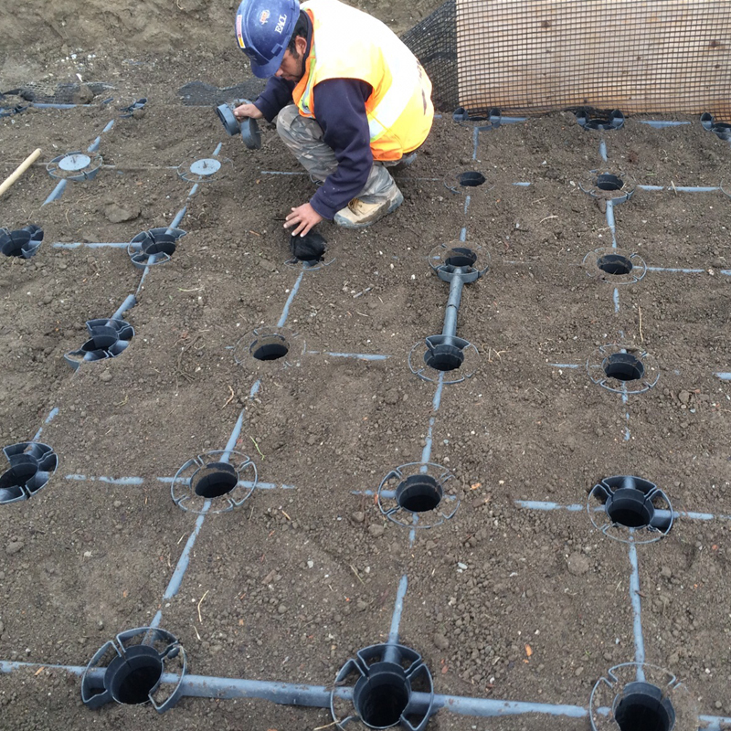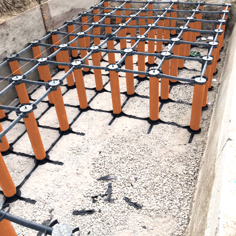 El sistema está compuesto por elementos de plástico reciclado y puede integrarse fácilmente con los sistemas de riego. Se instala de forma sencilla y hace de encofrado para el vertido del hormigón. De esta manera, el suelo que se genera es un solera autoportante de hormigón armado con una elevada capacidad de carga.