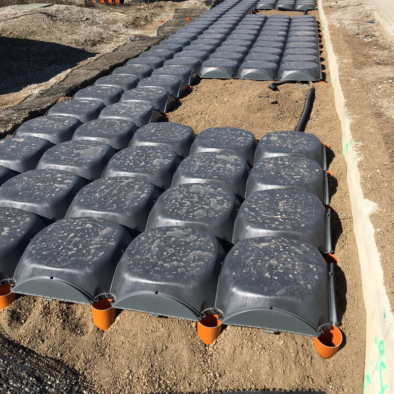 Cúpolex Raíces es un sistema patentado rápido y económico para la construcción de suelos en exteriores con capacidad de contener un gran volumen de tierra por debajo que permanece sano, no compactado y, por lo tanto, con capacidad de favorecer el crecimiento adecuado de árboles y plantas.