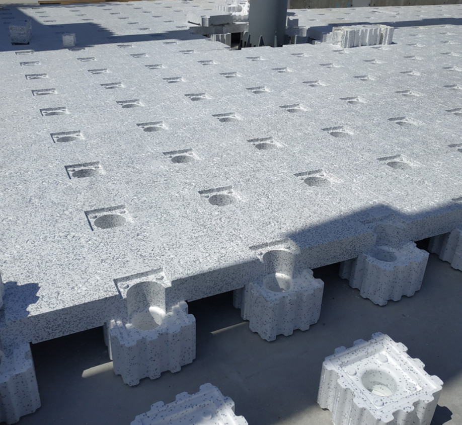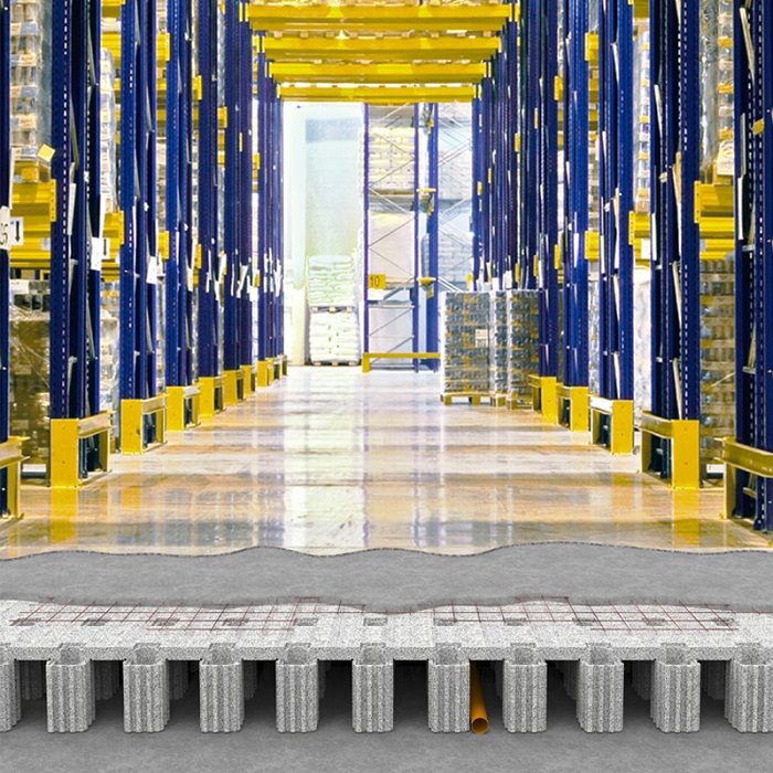 Altura de encofrado 11 cm, altura de cámara 3,7 cm, espacio para paso de tuberías 2,5 cm y espesor de aislamiento 7,3 cm. - IsolCúpolexⓇ + bandejas.