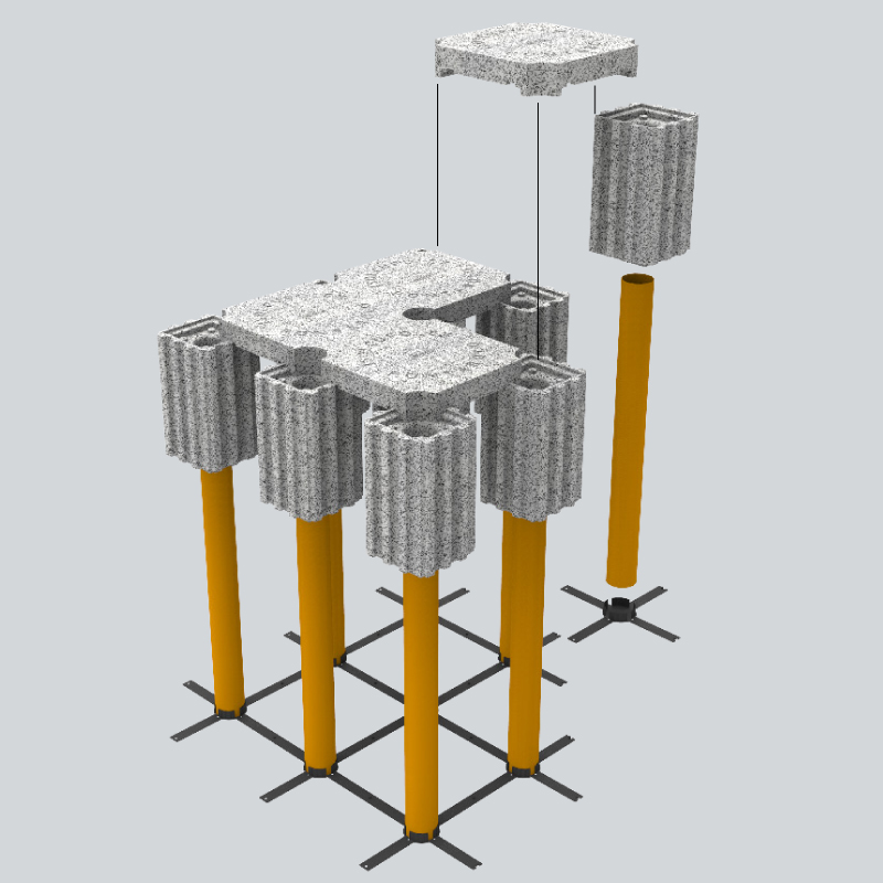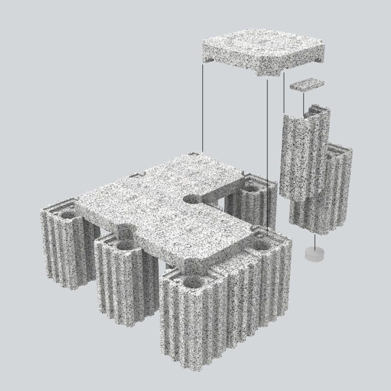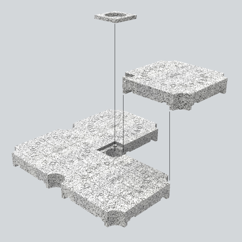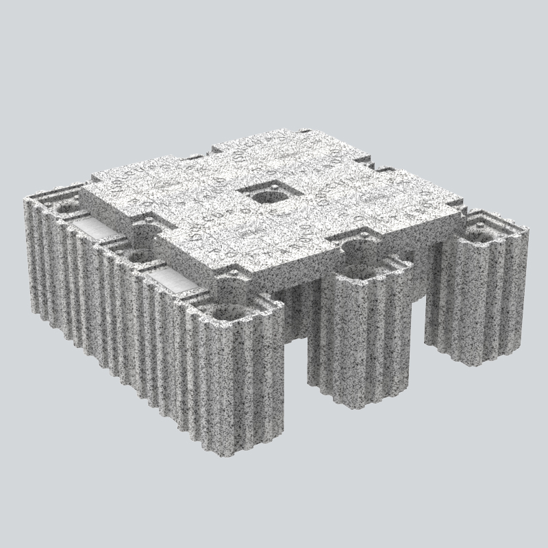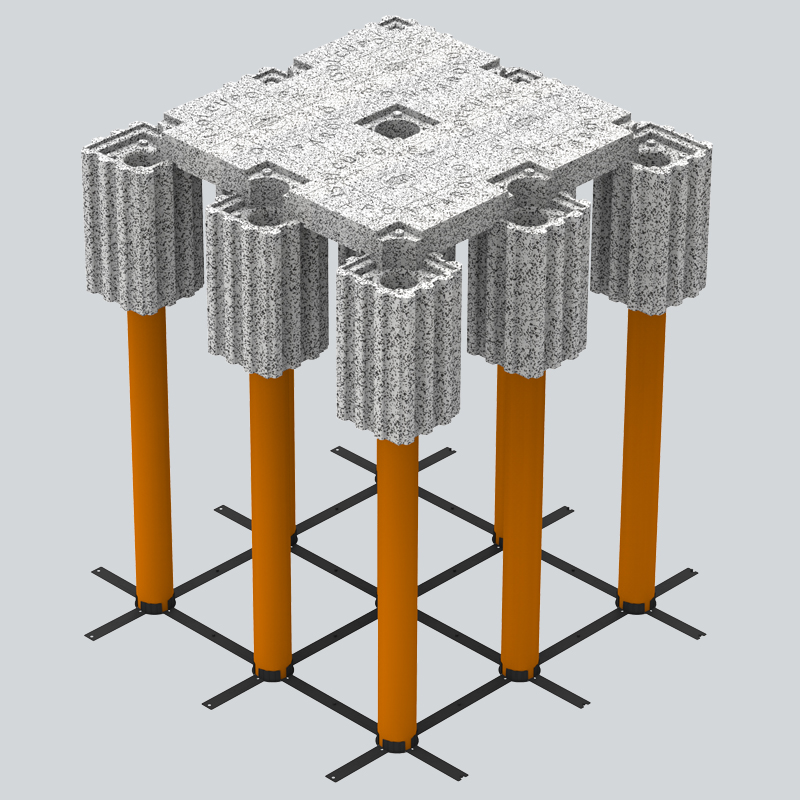 Altura de encofrado a partir de 23,5 cm, altura de cámara a partir de 16,2 cm, espacio para paso de tuberías a partir de 15 cm y espesor de aislamiento 7,3 cm. - IsolCúpolexⓇ + tubo + isolpié.